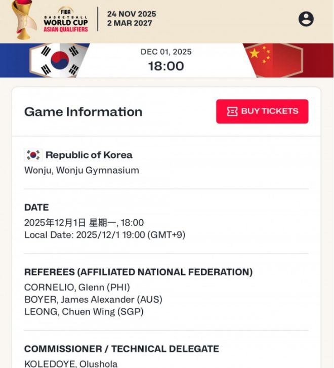 除此之外,根据媒体人球圈赵探长报道,中国男篮与韩国男篮的二番战,3位裁判的安排已经出炉:“明日世预赛中韩二番战裁判来自菲律宾、澳大利亚和新加坡,其中新加坡裁判梁俊容执裁过CBA,官网球员名单暂无变化。”
